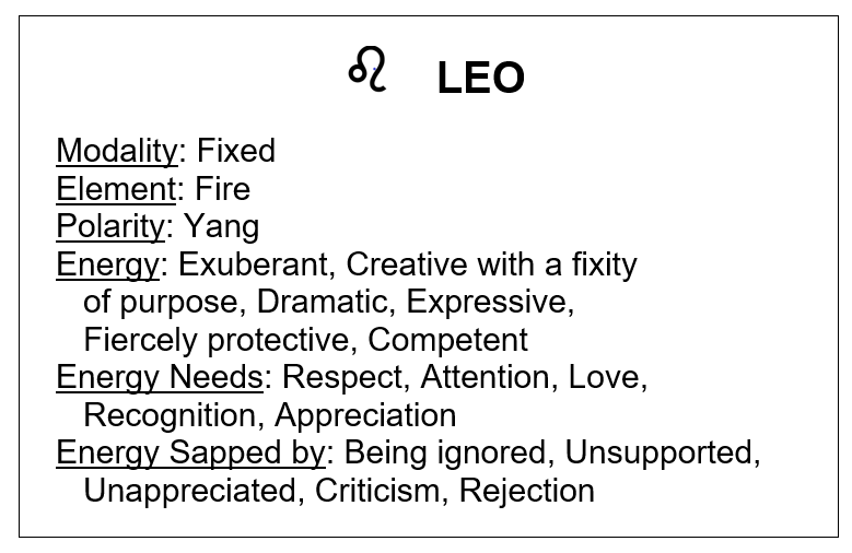 The yang, masculine energy of this sign further strengthens your personality expression as outgoing and dynamic. The yang/masculine energy is positive, active, extroverted, and expressive in nature. With this energy, you prefer to initiate activities instead of passively standing by waiting for someone else to act. It is a part of your authentic “I will” nature to take charge, especially in new situations. In fact, you feel very strongly that you need to always be in charge of your environment. It is not for you to let someone else run the show. Luckily, most of the time others look to you to take charge. (Complete Book of Astrology, p.55). The manner with which you take charge is enthusiastic and confident. The style in which you lead can be imperious and autocratic at times, especially when you feel you have lost the attention and admiration of your followers. Generally, however, you prefer to be entertaining and caring in your leadership role. You are loyal to and fiercely protective of your friends and loved ones. You do not tolerate injustice to others or to yourself.
