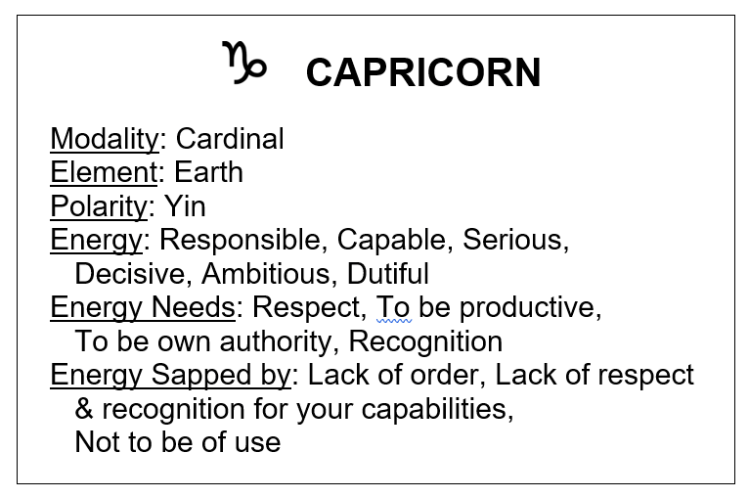 The course of action you take is based on the yin energy of the Capricorn sign. Yin energy is emotionally centered vs. logically centered. It is receptive, quiet, and reserved. You take yourself and your responsibilities seriously. Although the emotional yin energy of your rising sign is what influences your instinctive mode of behavior, you do not “wear your emotions on your sleeve.” Instead, you work hard to manage your emotional responses to others in a way that is controlled and respectful. Emotional maturity and personal responsibility are highly valued by you. You do not allow yourself to exhibit emotional neediness nor to have emotional outbursts. It is not in you to placate this kind of behavior in others, either.