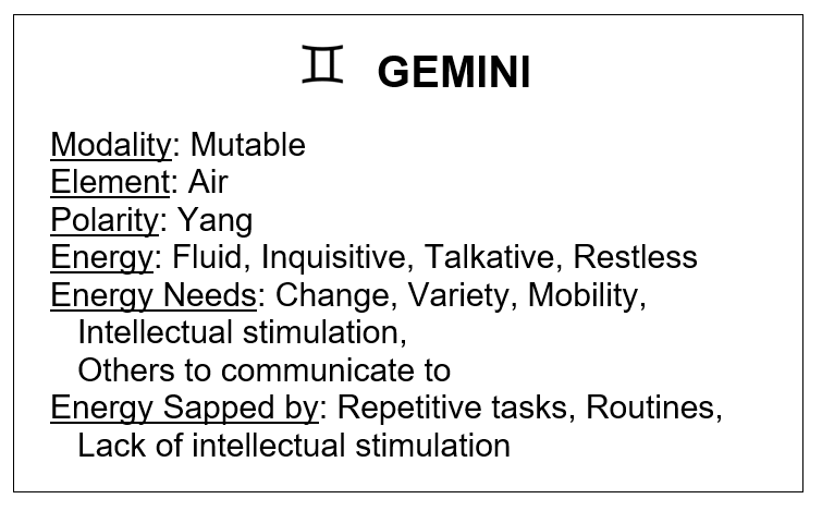 Gemini is a sign made up of yang, mutable, and air energies. Yang energy gives this sign its active, expressive, and extroverted qualities. The mutable quality diffuses your energetic approach so that you are instinctively flexible and adaptable in your approach to day-to-day life. Change and variety in your everyday life energizes you. The air element rounds out the energy of this sign by adding a desire to express yourself with words and ideas. With this sign rising, you are mentally quick and like to stay well informed. You enjoy communicating with others on a wide variety of intellectual topics and can be quite witty, if a little excitable in your conversations with others. (A Spiritual Approach to Astrology, Gemini section and The Only Astrology Book You’ll Ever Need, p.226)