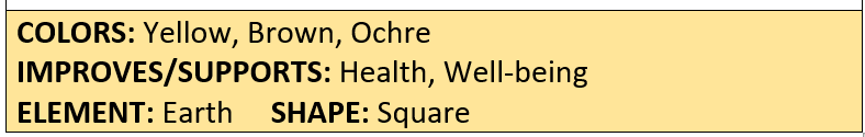 The element for this area is earth. The earth element is grounding, stabilizing, balancing energy. Energizing this area with the colors of earth (brown, terracotta, yellow, and green) and objects made from the earth, such as ceramic and clay, will promote feeling grounded, stable, and balanced. Adding touches of red in this area will promote recognition and acknowledgement of your Authentic Self. Symbols of peace and harmony, square objects, and artwork depicting mountains, flowers, the earth, sun, stars, or a sunrise all enhance the energy of this area. Healthy plants, a vase of artificial or real flowers and a bowl of artificial or real vegetables and fruit will also encourage beneficial chi in this area. Placing a square rug in the center of the room will give the space a sense of grounding and security. (Feng Shui Quick Guide for Home and Office, pp. 60 & 70) (feng shui your life, pp. 124 & 125)