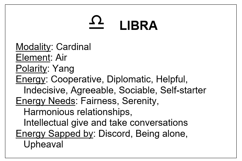 The air element gives an intellectual and communicative quality to your temperament and behavior style. Libra is a social sign and you relate with others through communication. Enjoying the give and take of conversations, you are just as happy discussing topics that are light and frivolous as you are discussing topics that are deep and meaningful. Your preference for peace and harmony in relationships influences how you communicate. It is easy for you to make conversation and be pleasantly charming in social situations. Sharing experiences with someone is more important to you than going it alone. In some cases, your desire for companionship makes it difficult for you to maintain your independence in a relationship. Because your desire to not be alone is so strong, you may find yourself over compromising and ignoring your own needs in order to keep the other from leaving. (Astrology for the Light Side of the Brain, p.72)