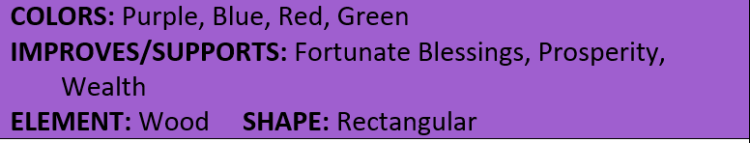 In Feng Shui, the best place to start setting this intention is the Wealth and Prosperity area of your home. It is located in the rear left area (Western) or southeast side (Classical) of your home. This area of your house “must be clean, uncluttered, and well maintained.” (Feng Shui Demystified, p.72) Fix or remove anything that is broken, dirty, or faded. Also, remove any unhealthy plants from this location. Placing things here that represent wealth and abundance to you (they do not have to be expensive things) intensifies the feeling of prosperity. The best colors to use in this area to represent wealth and abundance are purple, blue, red, and green. These colors should be rich and vibrant not faded or muted. A water feature such as a fountain or aquarium placed here will increase the energy in this area. (Feng Shui Demystified, pp. 72 and 73). The exception to this is when a bedroom is in the rear left area or southeast side of your home. Fountains and aquariums are considered to have a negative influence when placed in bedrooms.