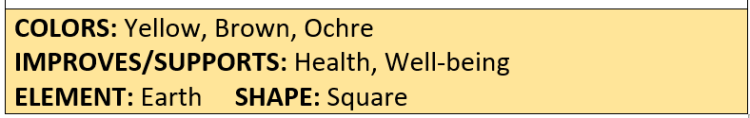Creating earth energy in your environment will serve to energetically address these needs. The two areas in your home to focus on when adding the earth element are the Relationships area and the Health/Unity area.
