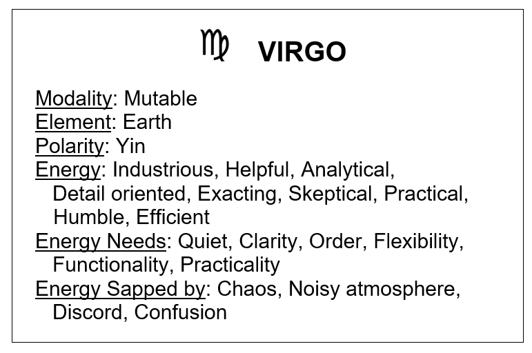 Virgo is a sign made up of mutable, earth, and yin energies.
